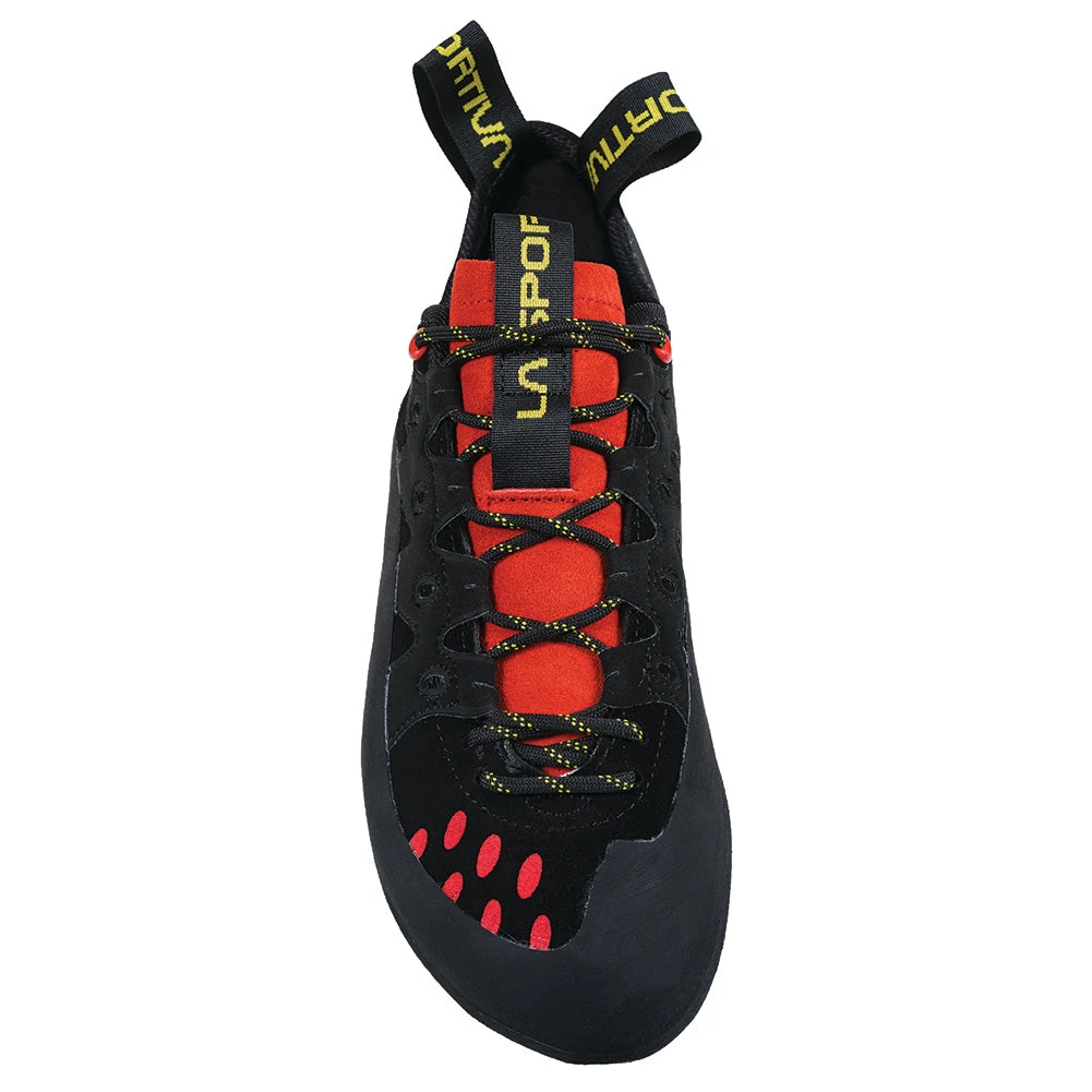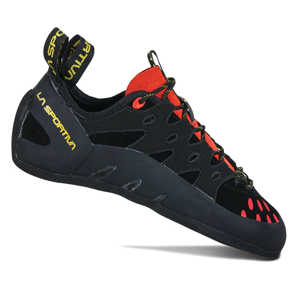 A best selling shoe from La Sportiva for gym climbers and outdoor climbers looking for a quiver-of-one shoe that does it all! All-purpose lace-up shoe made with unlined leather and a synthetic leather overlay lacing harness. Top rated shoe in the value-oriented category. Lined tongue for moisture management. The FriXion® RS rubber is hard wearing yet sticky for long life.