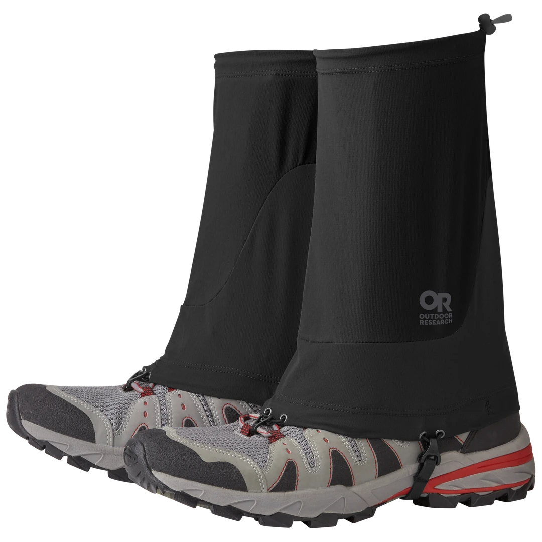 These ultralight low-profile pull-on Ferrosi Thru Gaiters from Outdoor Research are stretchy, abrasion resistant, weather resistant, and are designed to keep debris out of your shoes and socks while wearing trail running shoes, approach shoes, and low-profile hiking footwear. Other features include a shoelace hook, replaceable instep strap, and a drawcord cinch closure at the top to provide a snug fit. The ultralight design eliminates the zippers, velcro, and snap closures of traditional gaiters. This design makes these very low bulk, and they must be pulled on over your foot and lower leg first before putting your footwear on and fine tuning the fit.